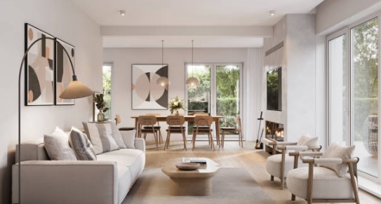 Le abitazioni sono sviluppate su due livelli e così distribuite: al piano terra l'ingresso porta direttamente nella zona living, dal soggiorno con angolo cottura è possibile uscire direttamente all'esterno, proseguendo verso il disimpegno accediamo al bagno/lavanderia e al garage comunicante all'abitazione.